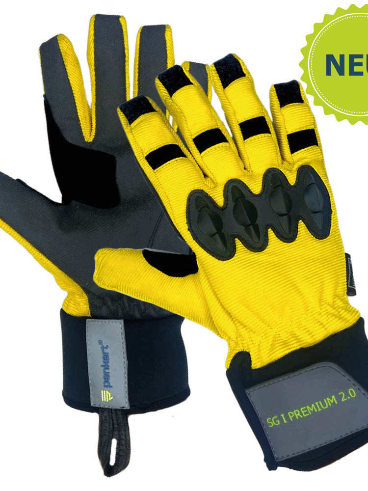 Gelb-rote Handschuhe mit Knöchelschutz, Vorder- und Rückansicht.
